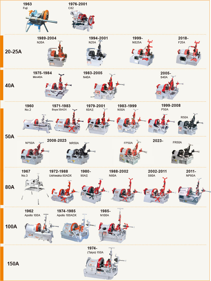 In 1960, Rex began its first mass-production of electrical threading machines (No. 2 pipe machine). It was the first step in