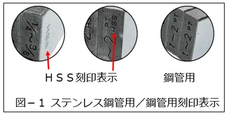 ステンレス鋼管用はチェーザの最後部、もしくは上平面に「HSS」の刻印がされています。鋼管用には「HSS」の刻印表示はありません。図-1をご参照ください。
